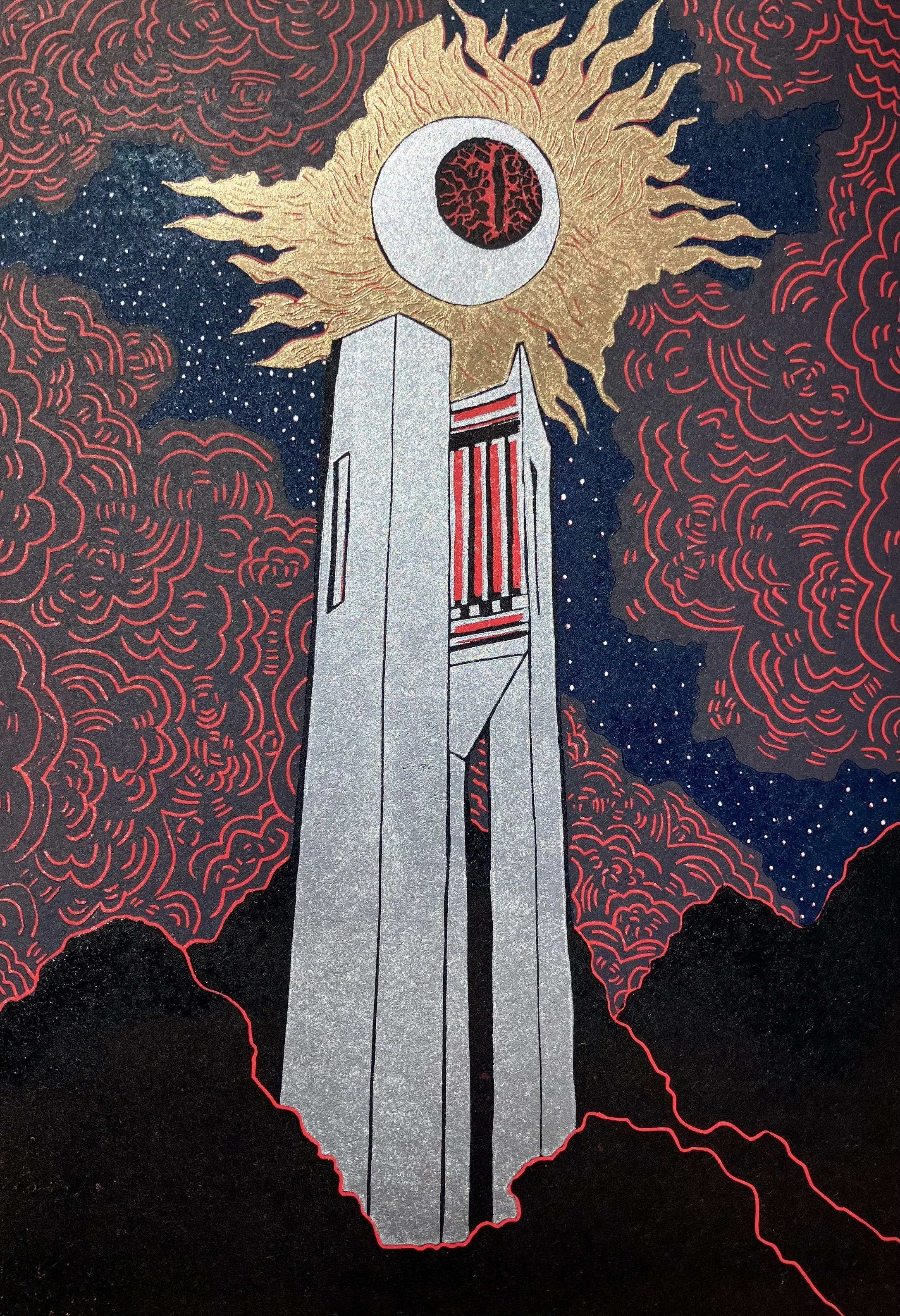 I first realised the demonic potential of the National Carillon when I saw it lit up at night in blood-red floodlights. While the title reflects my original intention for this print to be a Lord of the Rings/illustrated fantasy novel homage, the scarlet and metallic palette seems to have snuck in from the corner of my brain that loves the retro science-fantasy video game aesthetic.