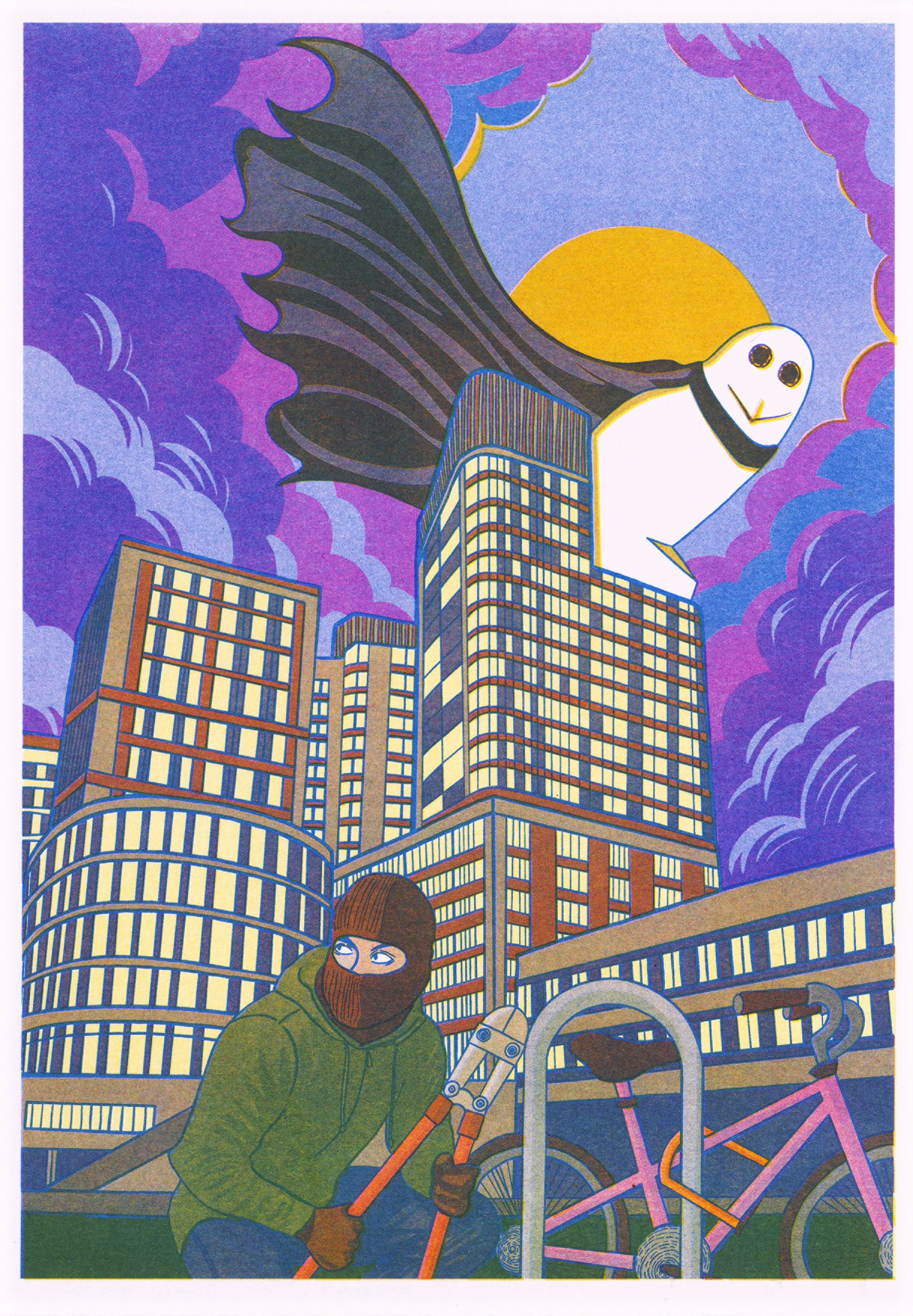 This design was printed by Helio Press in blue, yellow and fluorescent pink inks on an RP3700 risograph duplicator. The colours in this print were created by layering these 3 ink colours at different levels of transparency (achieved by adjusting the density of the tiny ink dots that make up all risograph prints). Because the true colour of risograph ink can only be approximated on a computer or phone screen, this print is best enjoyed with the naked eye.